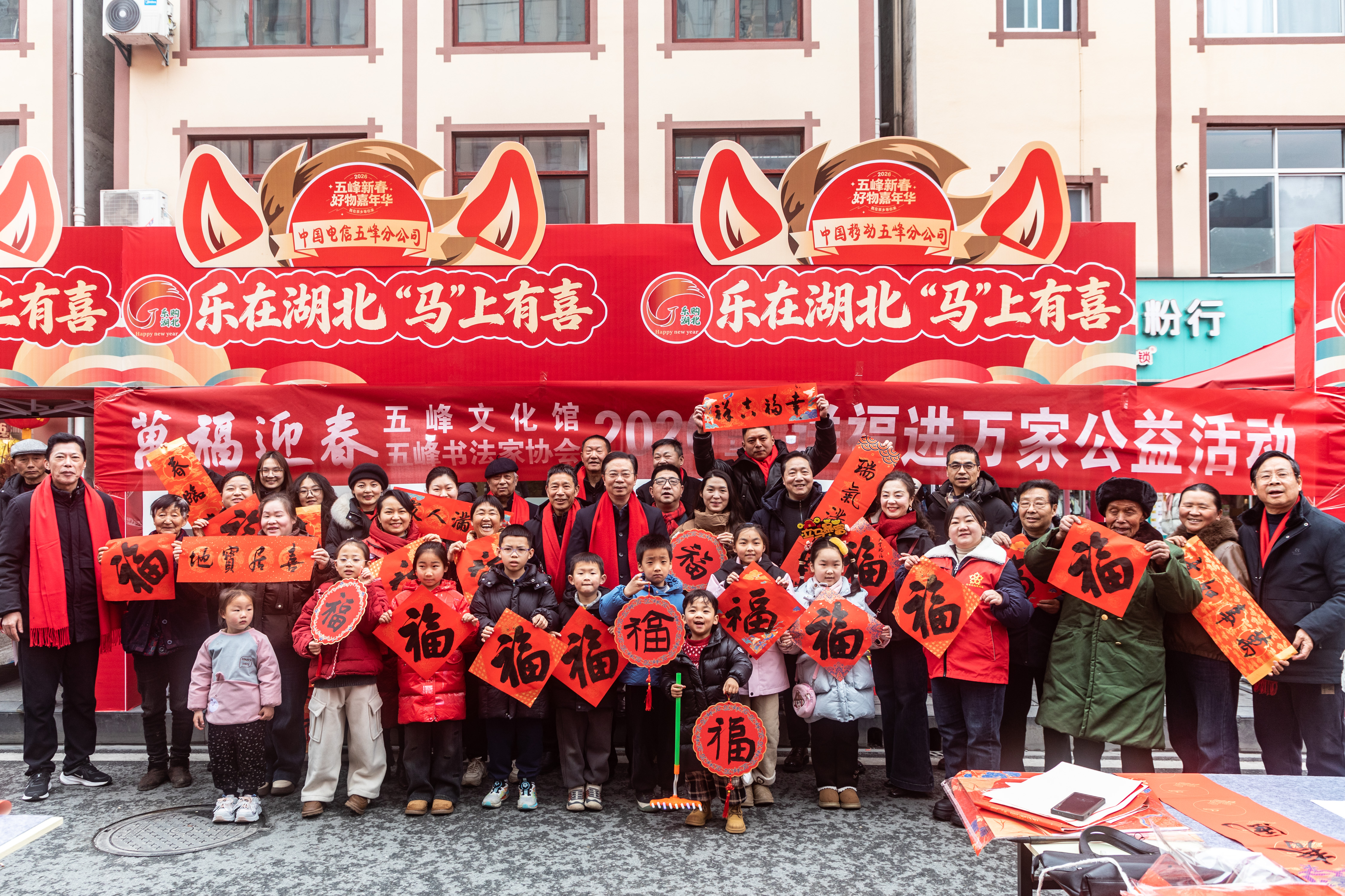 2月7日下午,“五峰新春好物嘉年华”集市内墨香四溢、暖意融融。县文化馆携手县书法家协会精心策划的“送万福 进万家”2026年新春送福送春联活动,在一片欢声笑语中圆满落幕。据统计,本次活动持续近4小时,累计吸引500余名群众热情参与,现场共送出春联200余副、各类“福”字及福卡500多张。